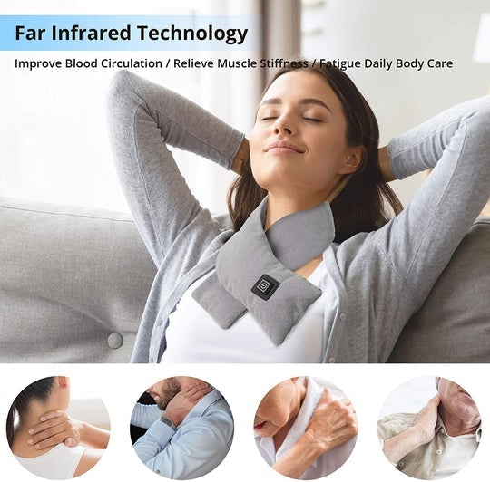 - Far Infrared Emission: Wear like an ordinary scarf and let the heated pad relieve neck pain. Also good for back pain, knee pain, and more. Graphene heating technology and release of 8-9mm far-infrared rays aid blood circulation and help relax tense neck muscles. The position of the heated pad can be adjusted for targeted therapy.